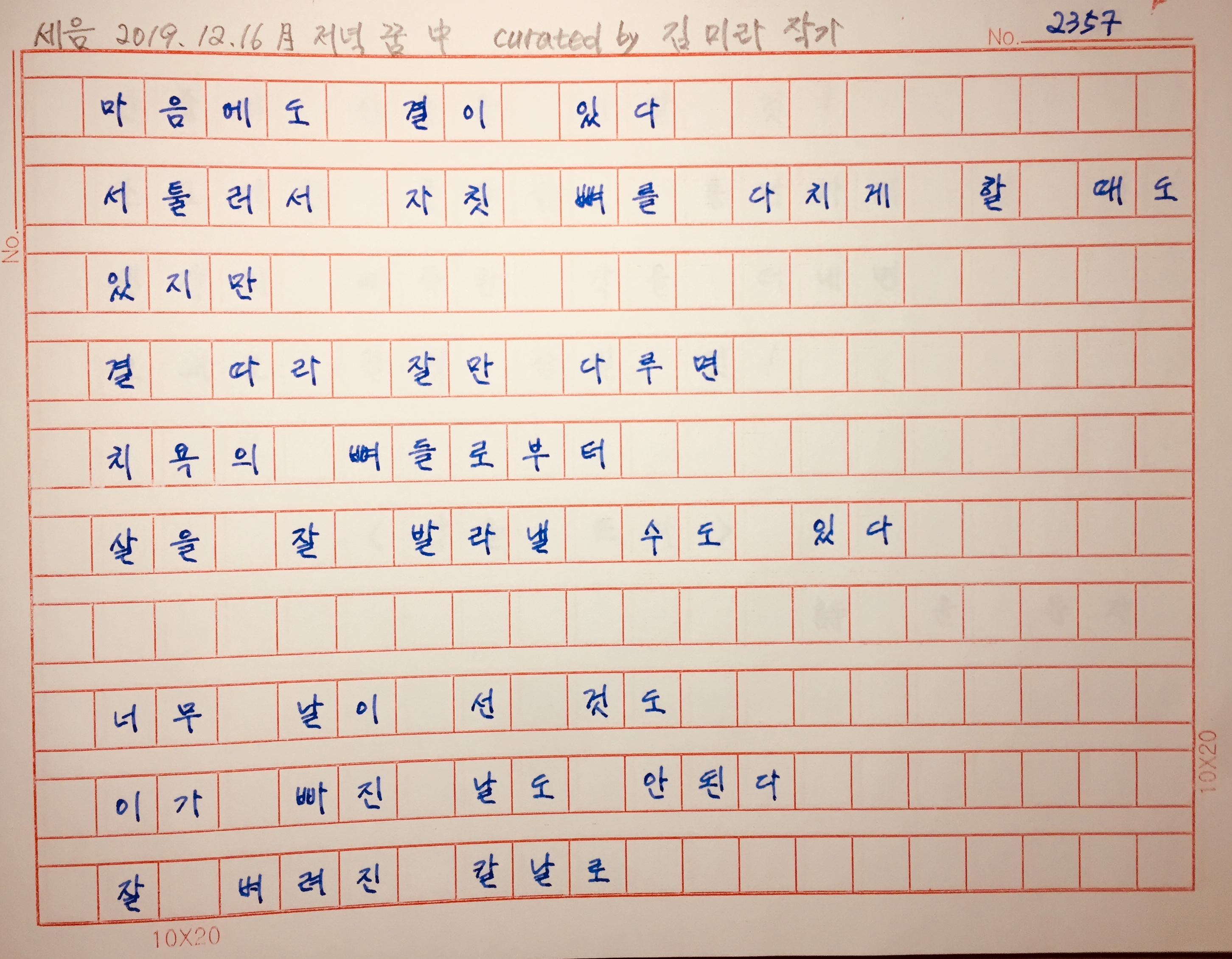 흐트러지기 쉽고 다치기 쉬운 마음을 정돈할 수 있게 해 주는 시.