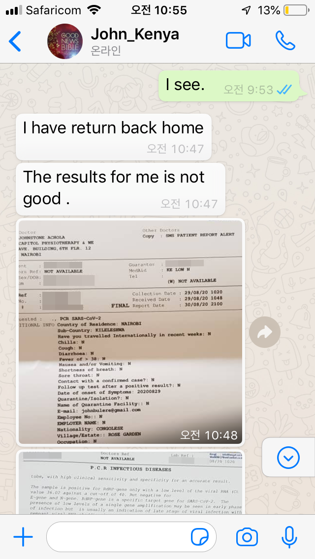가만히 생각해 보니 나이로비에 도착해서 부터, 코로나 검사를 받던 지난 토요일까지 John 과 나는 4일 동안 매일 만났고, 한 번 식사를 함께 했으며, 이동하는 차 안에서 그의 케냐 특유의 악센트에 영국식 발음이 뒤섞인 영어를 알아듣는데 애를 먹어 바짝 붙어 대화를 나누기 일쑤였었다.