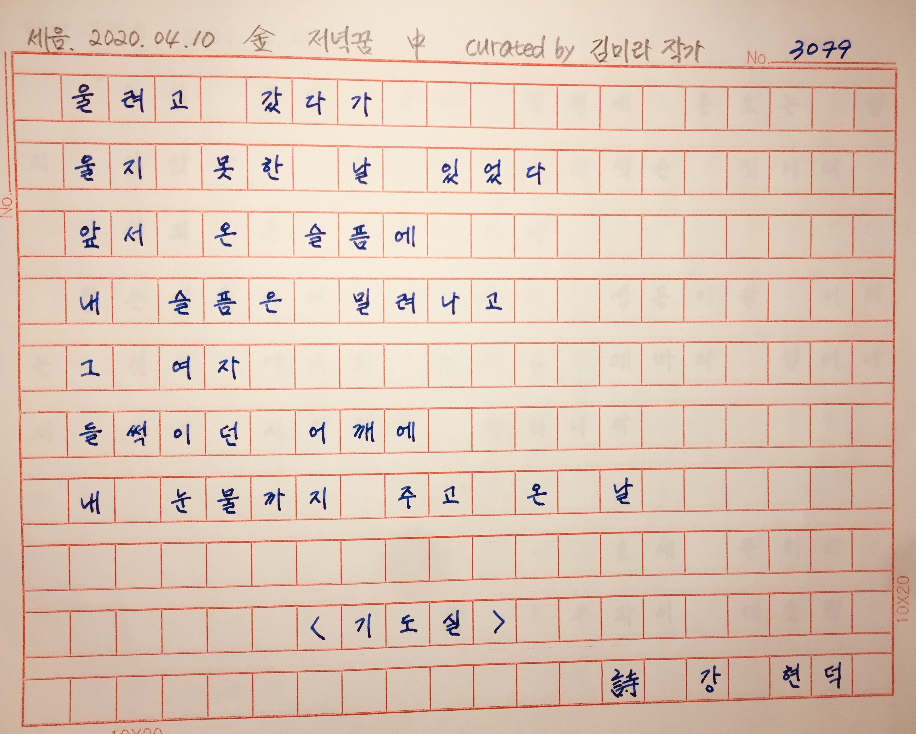 이 짧은 시를 읽고 나니 마음 먹먹해지는 저 기도실에 방금 다녀온 것 같습니다.