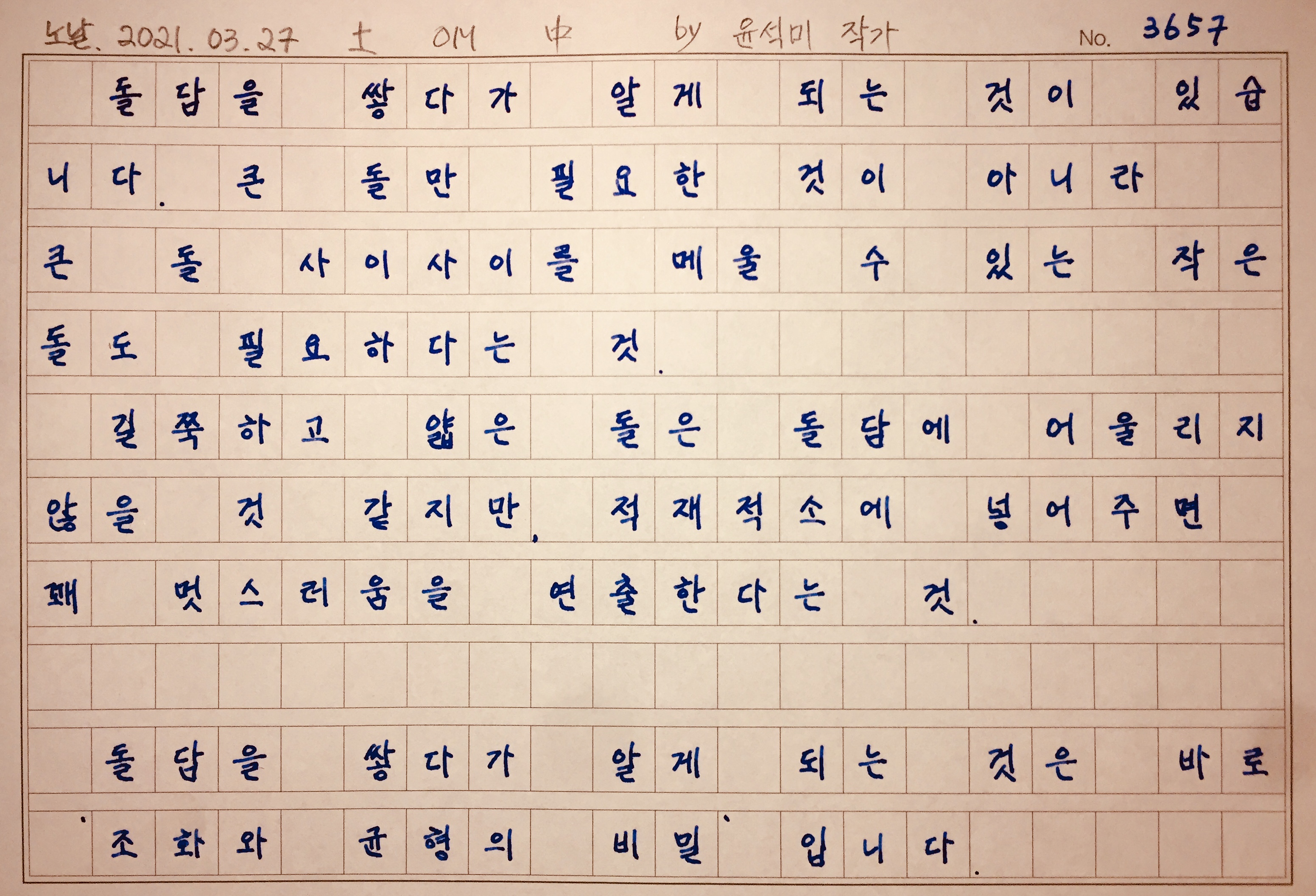 모난 돌이 둥근 마음을 지켜줄 수도 있습니다. 그 또한 마음의 조화와 균형을 위한 비밀일 겁니다."