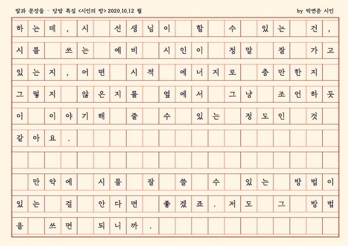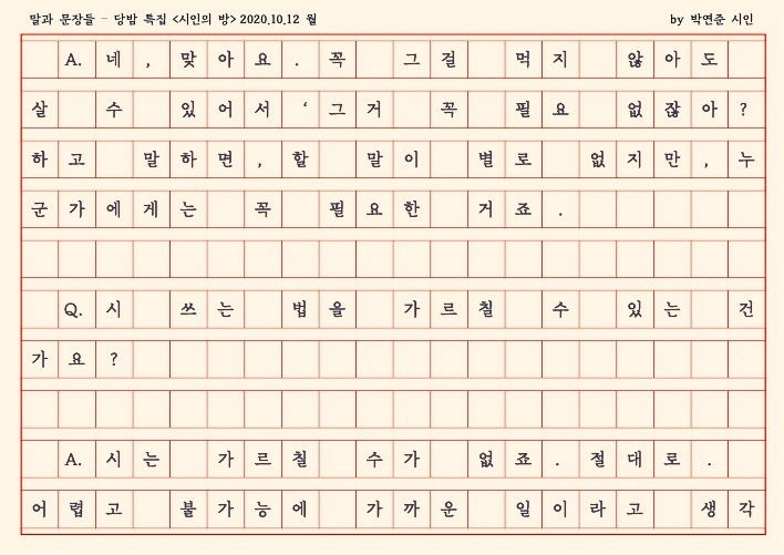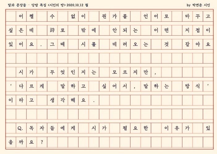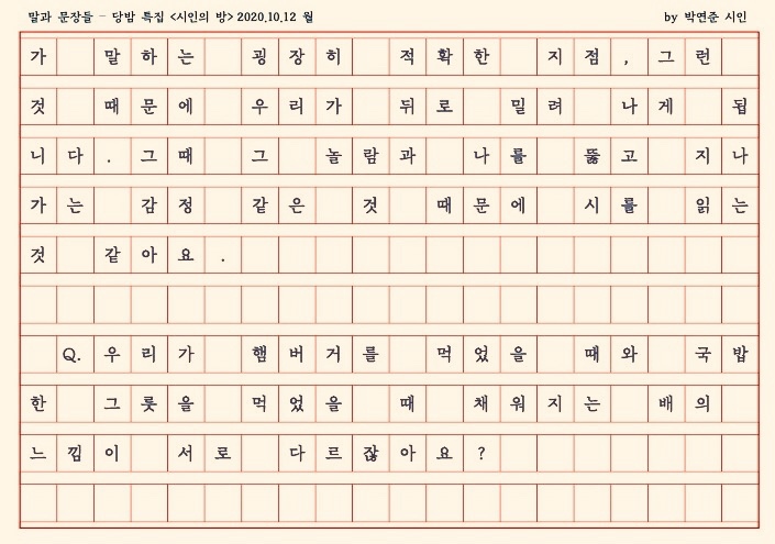 A. 음, 그러니까, 완성된 시 한 편을 말하는 건 아니고, 처음에 초고 쓸 때 그냥 저는 시라고 생각을 안하고, 연습장에 산문처럼 줄을 떼지 않고 그냥 쭉 쓰거든요.