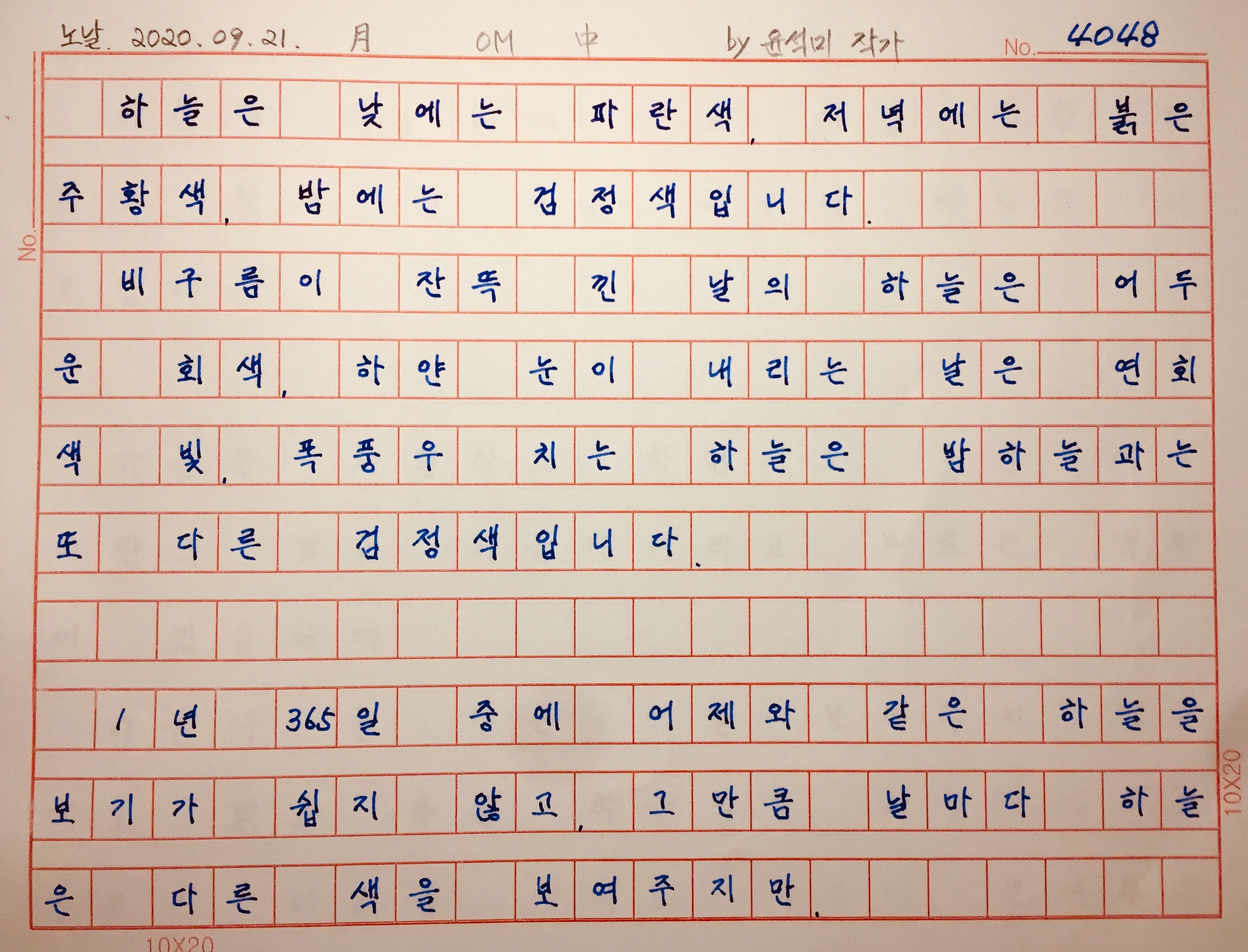 "일 년에 맑은 날이 몇 번 없는 인생 빛깔도 하늘색처럼 정한다면,