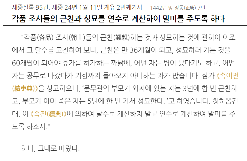 세종실록 95권, 세종 24년 1월 11일 계유 2번째기사 1442년 명 정통(正統) 7년 각품 조사들의 근친과 성묘를 연수로 계산하여 말미를 주도록 하다
