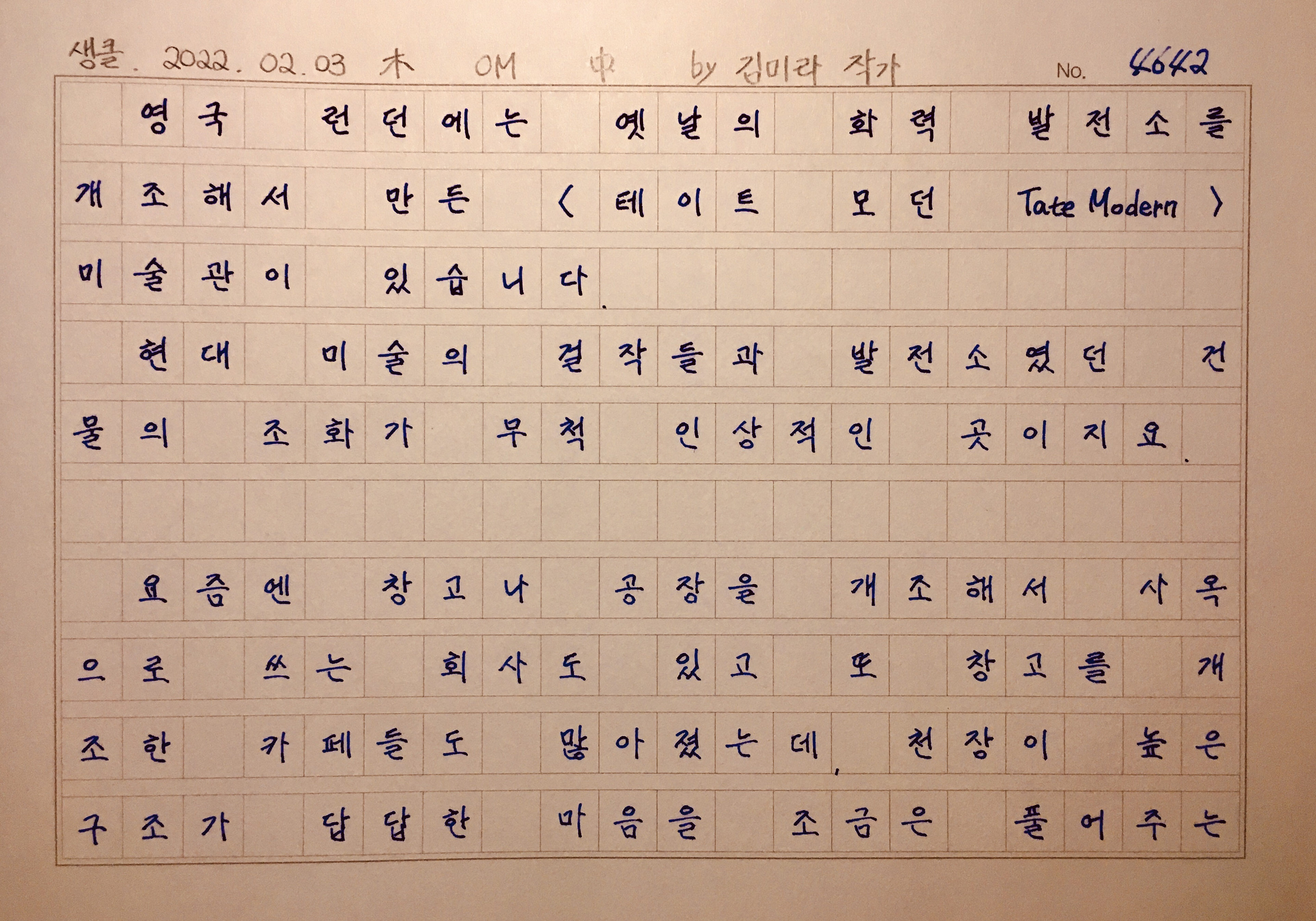 "테이트 모던 Tate Modern 미술관 또는 키가 큰 나무들이 자라는 식물원과 같은 카페에서 시간을 보내는 것처럼.