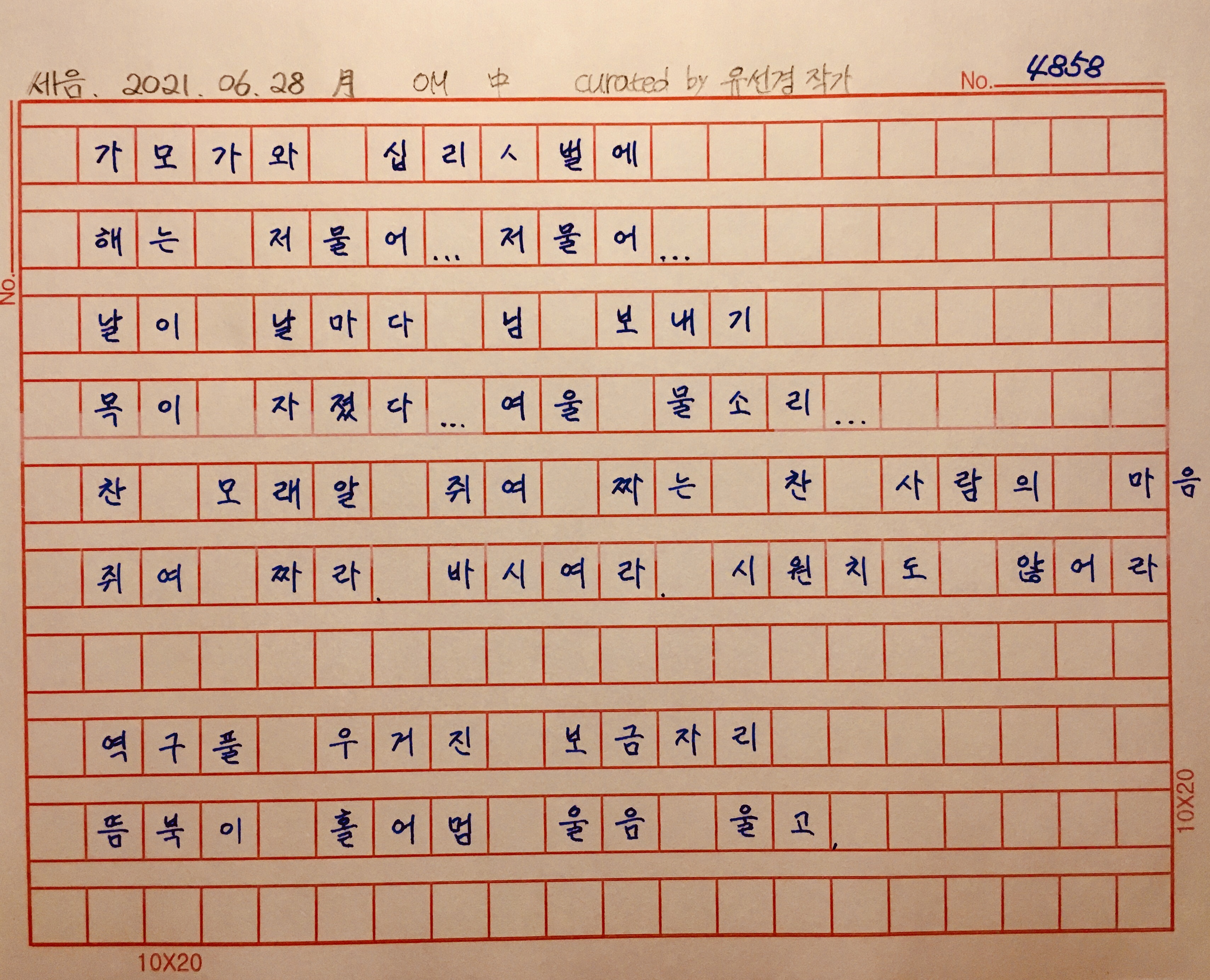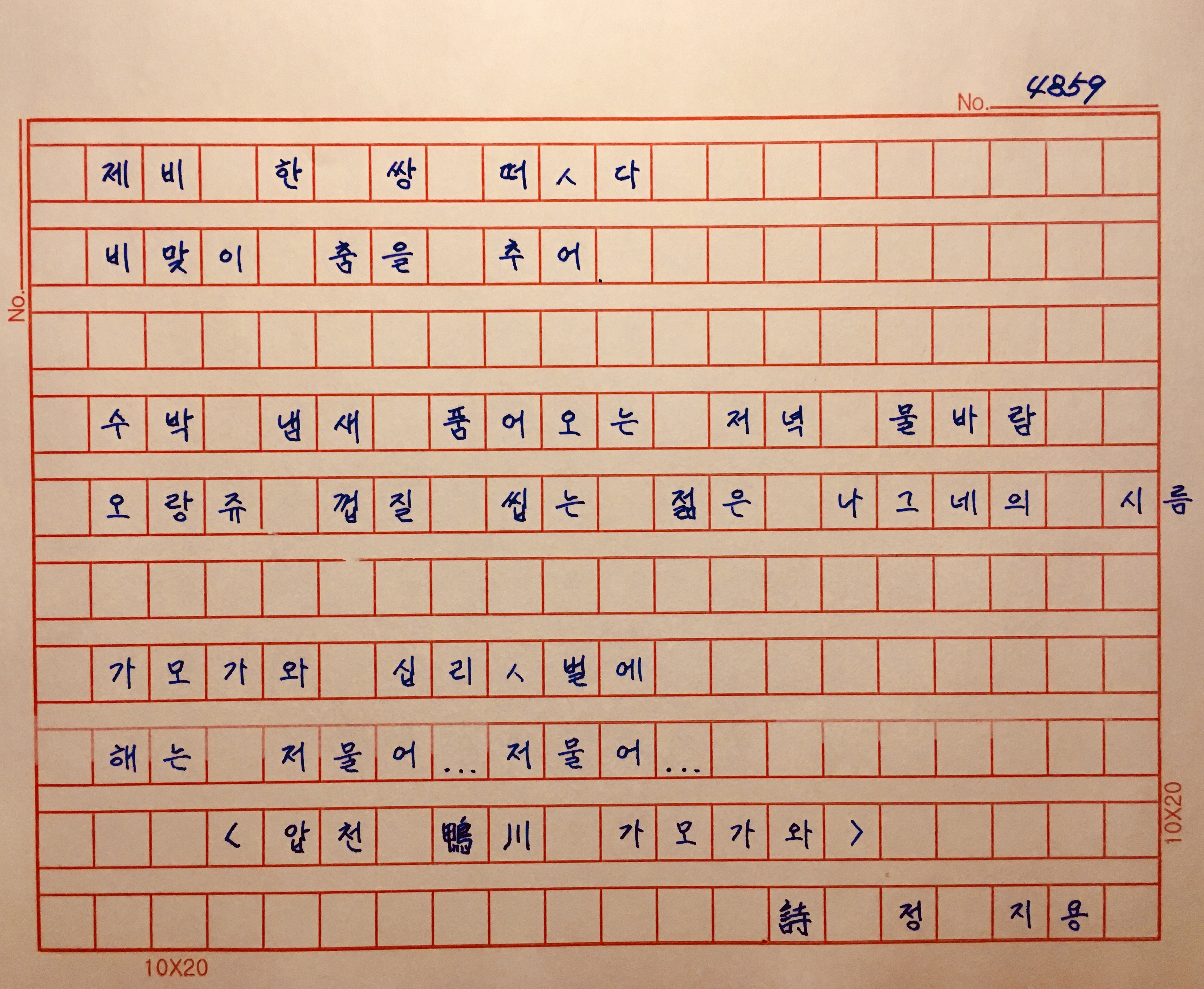 「압천」 전문 jeongjiyong 가모가와 십리ㅅ벌에 해는 저물어...저물어... . 날이 날마다 님 보내기 목이 자졌다...여울 물소리.... 찬 모래알 쥐여 짜는 찬 사람의 마음, 쥐여 짜라.바시여라.시원치도