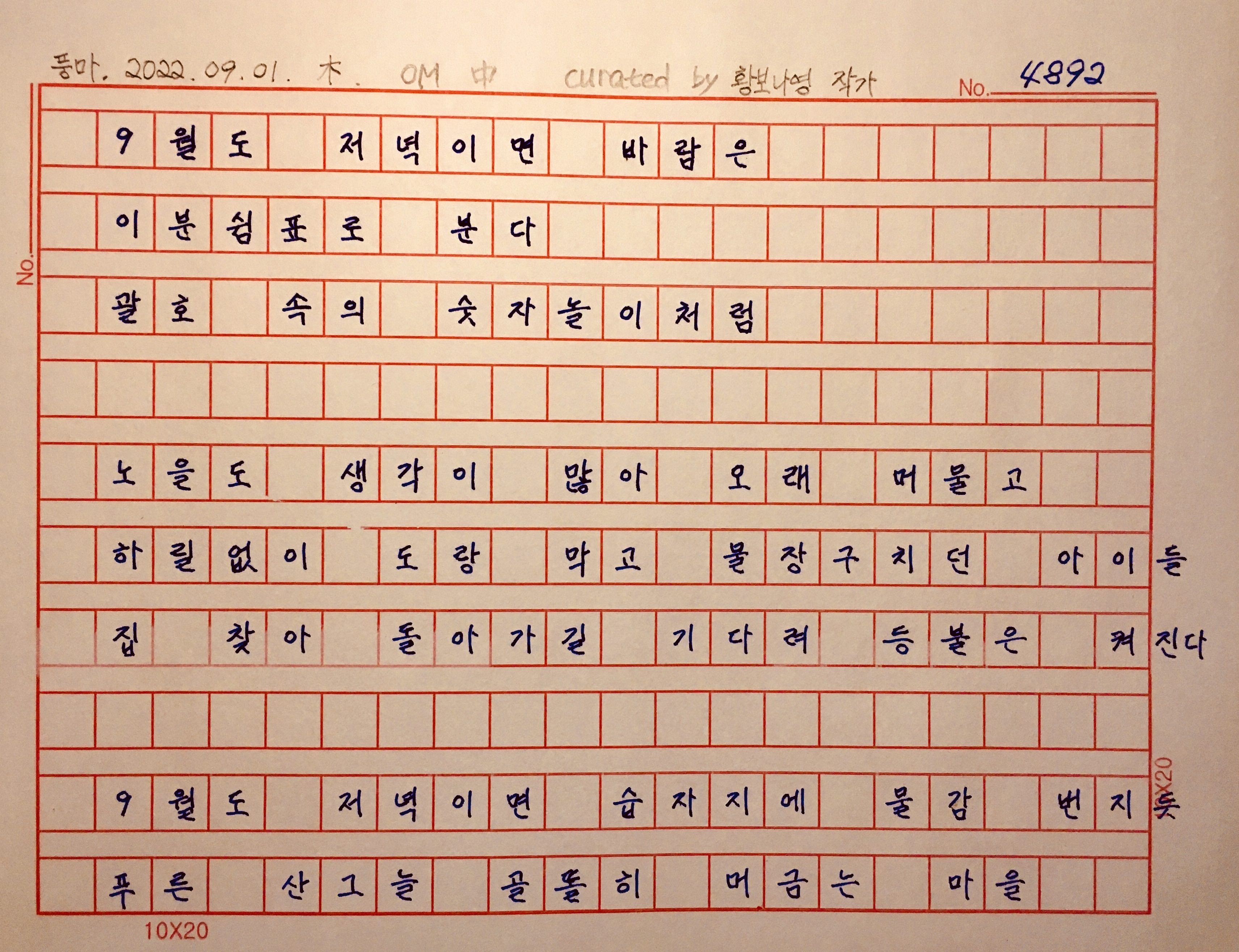"9월이 오면 저녁 노을도 생각이 많아 오래 머무는 것 같고.