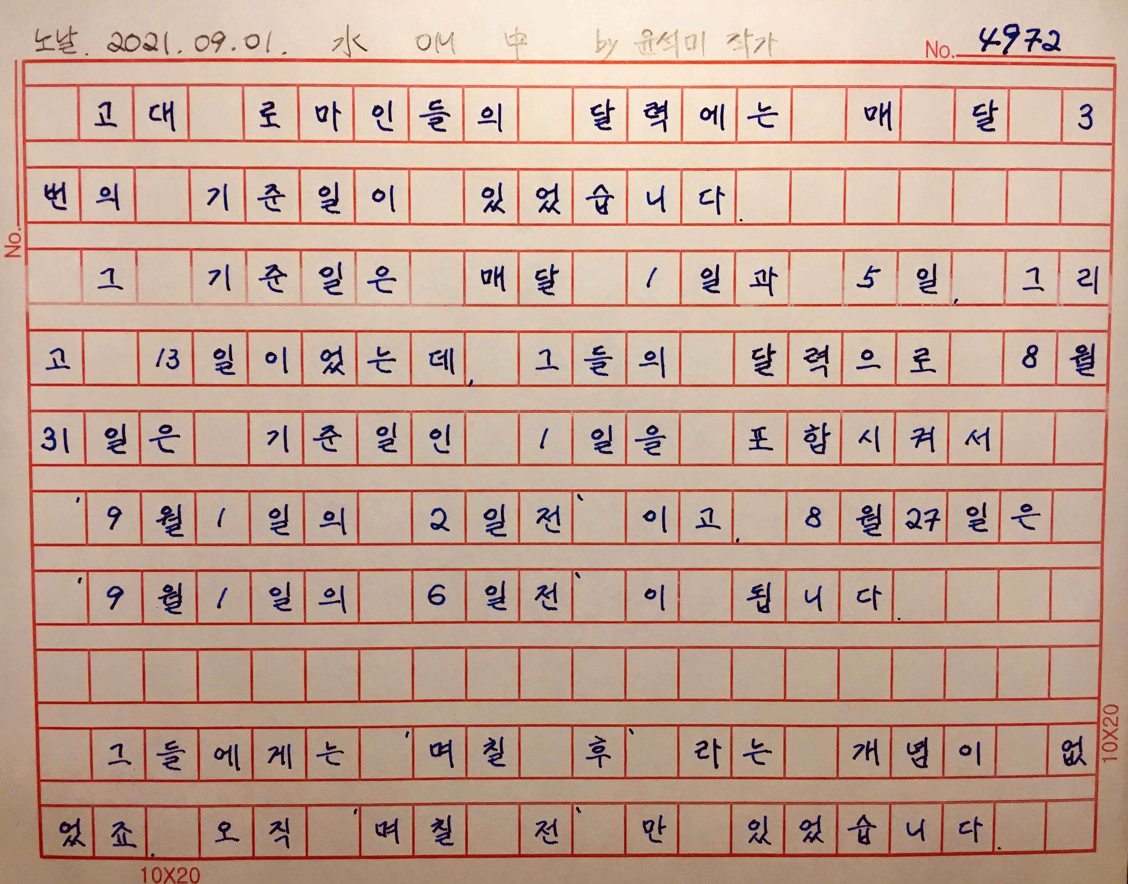 "고대 로마에서는 매달 1일을 칼렌다에 Kalendae, 5일은 누나에 Nonae, 13일은 이두스 Idus 라고 불렀습니다.