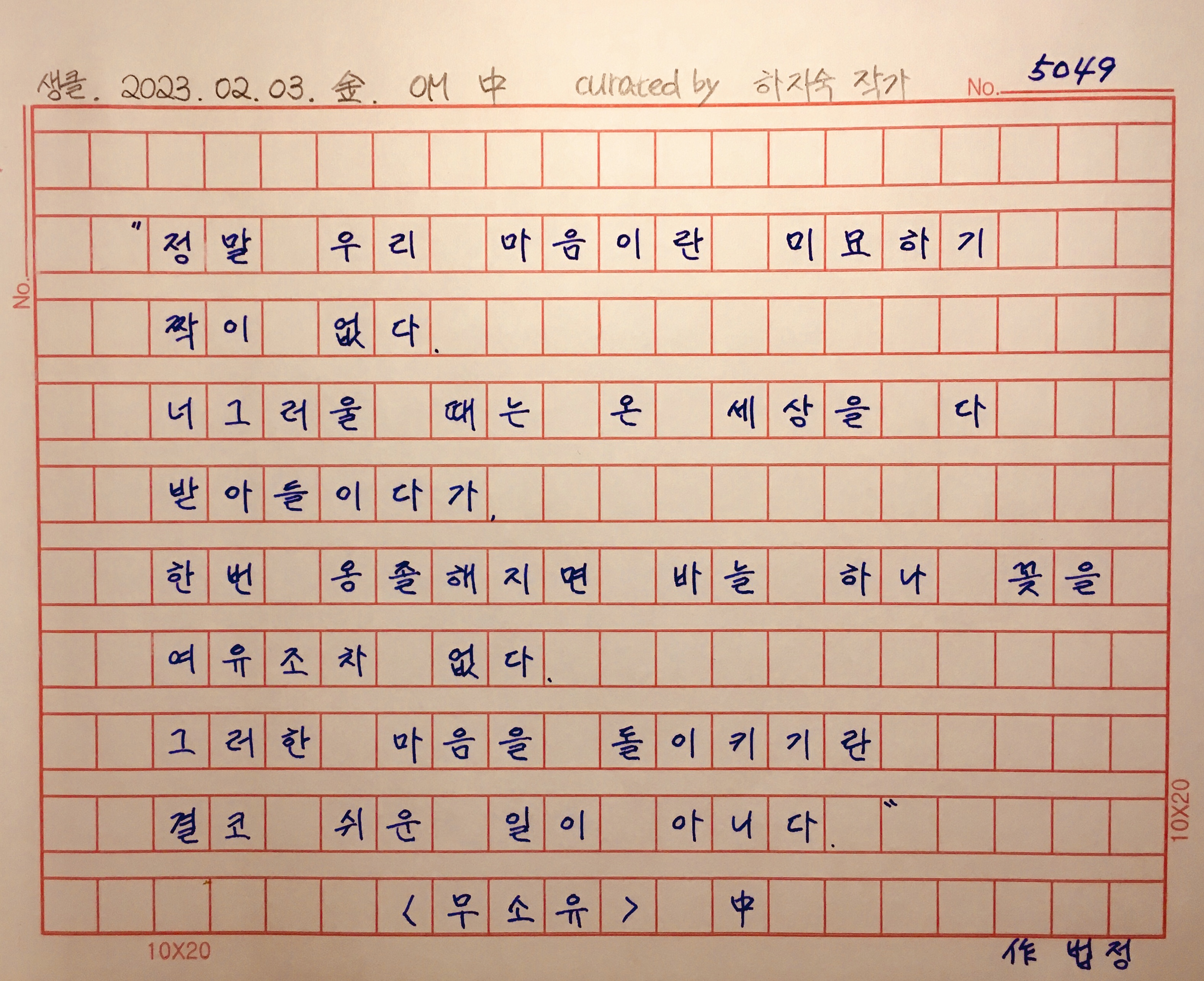 한 번 옹졸해지면 바늘 하나 꽂을 여유가 없는 미묘하게 짝이 없는 것이 우리 마음이라고요.