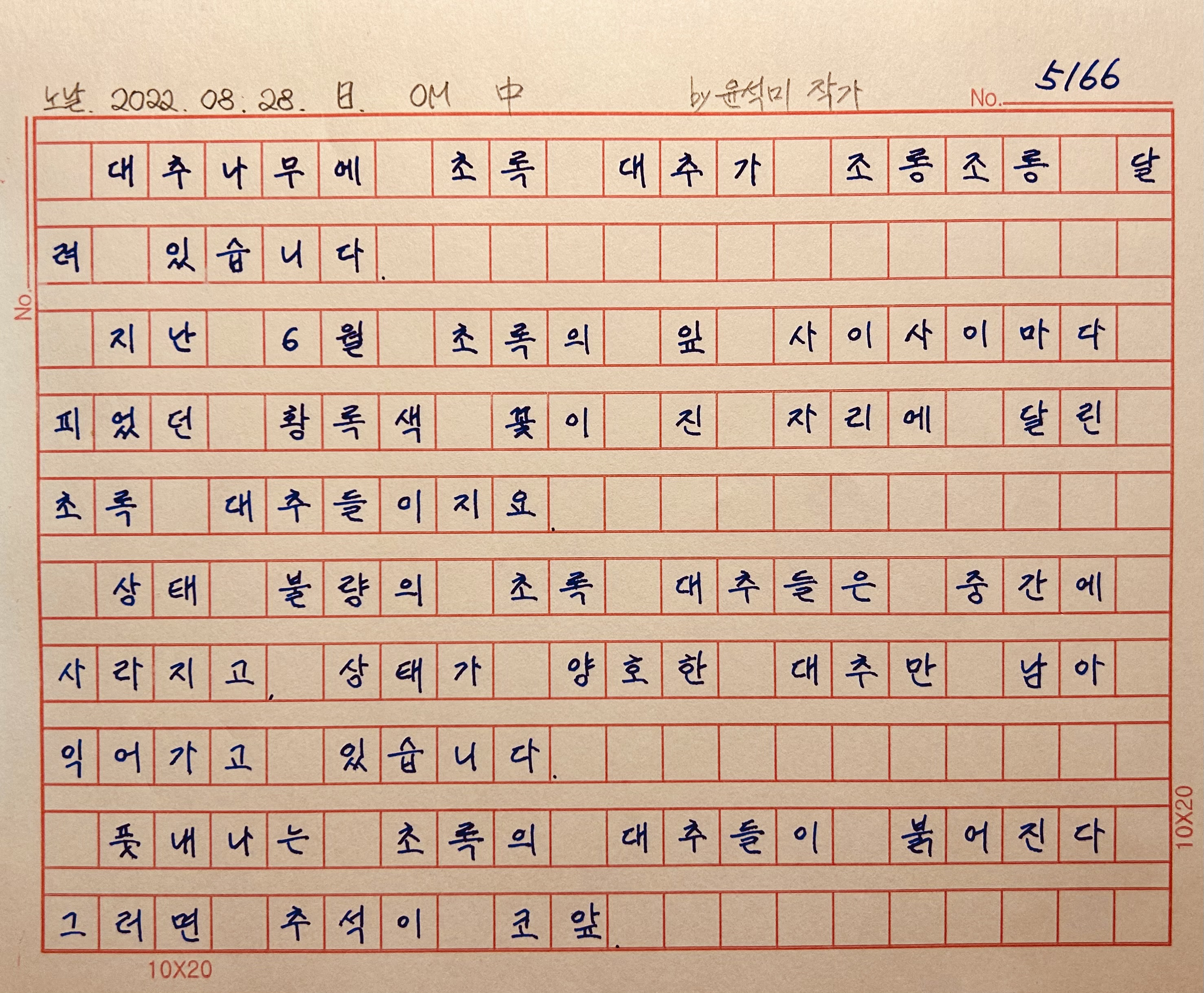 대추 나무가 꽃 피우고, 열매 맺고, 열매를 무르익게 하는 시간에 난 무엇을 했던가.