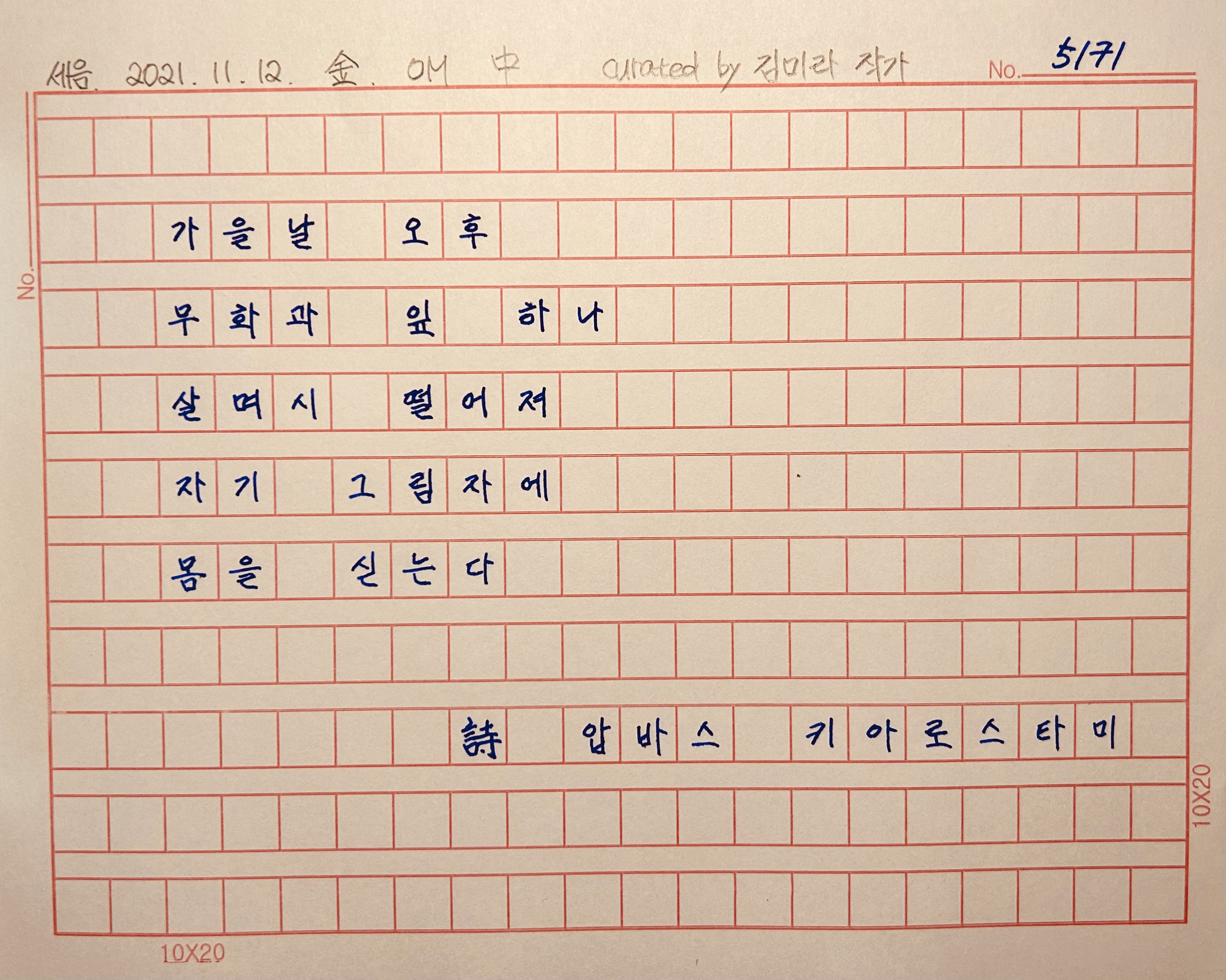 힘없이 떨어진 나뭇잎 위로 내려앉는 압바스 키아로스타미 Abbas Kiarostami의 짧은 시 한 수.