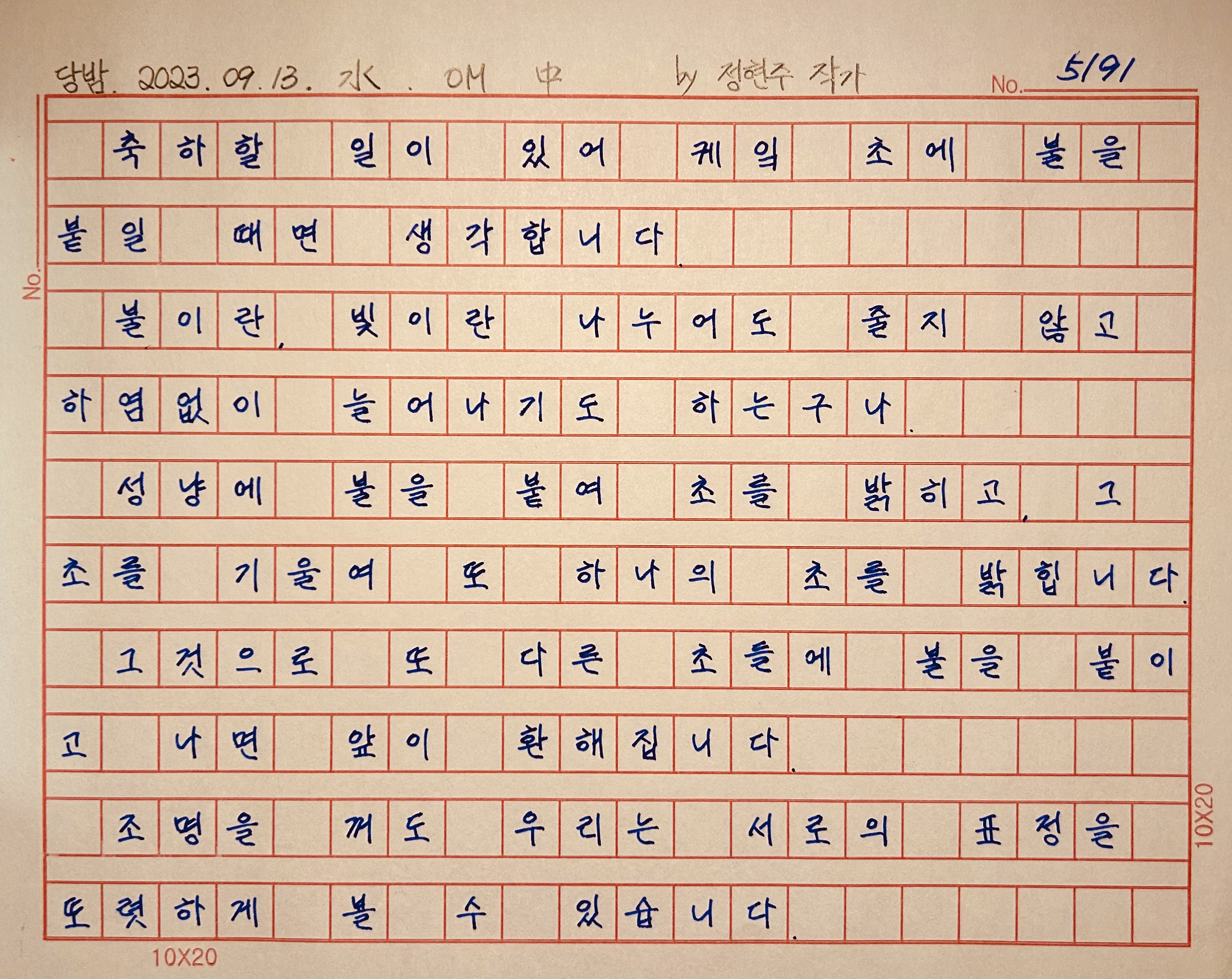 "조용히 밝혀지는 마음은 자꾸자꾸 나누어도.