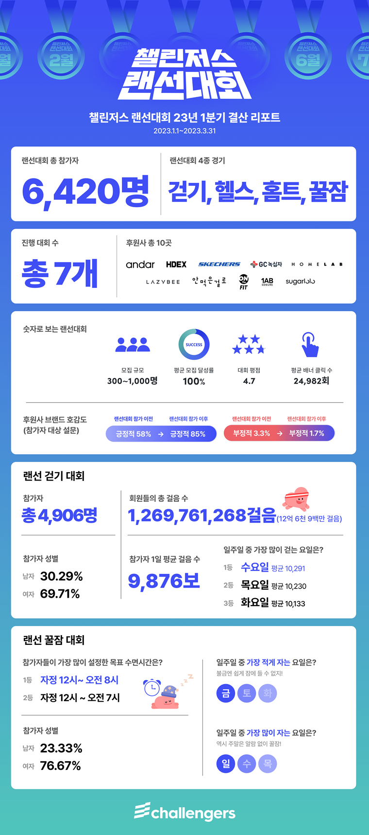 건강습관 형성 플랫폼 챌린저스에서 2023년도 첫선을 보인 랜선대회의 1분기 결산 데이터를 공개했다. 2023년 1월 안다르와의 ‘랜선 걷기 대회’를 시작으로 헬스, 꿀잠, 홈트 대회 등 총 7개의 랜
