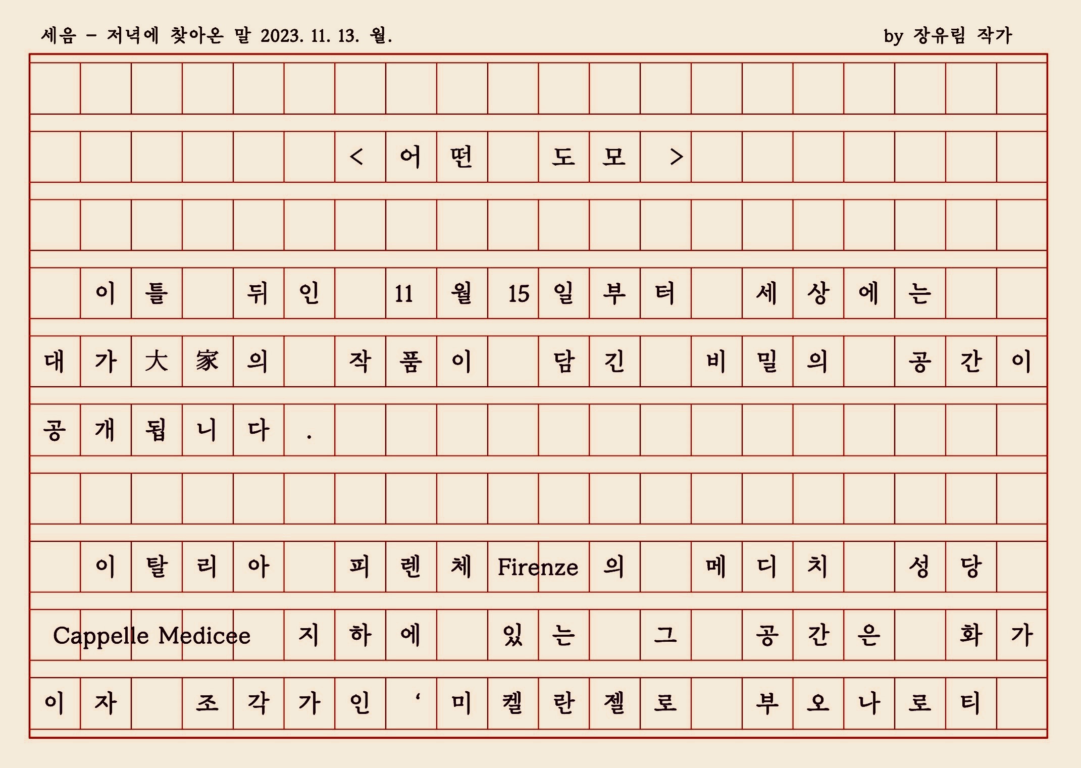 | 안녕! 오늘은 어떤 멋진 일을 할 거예요? (0) | 2023.10.29 |