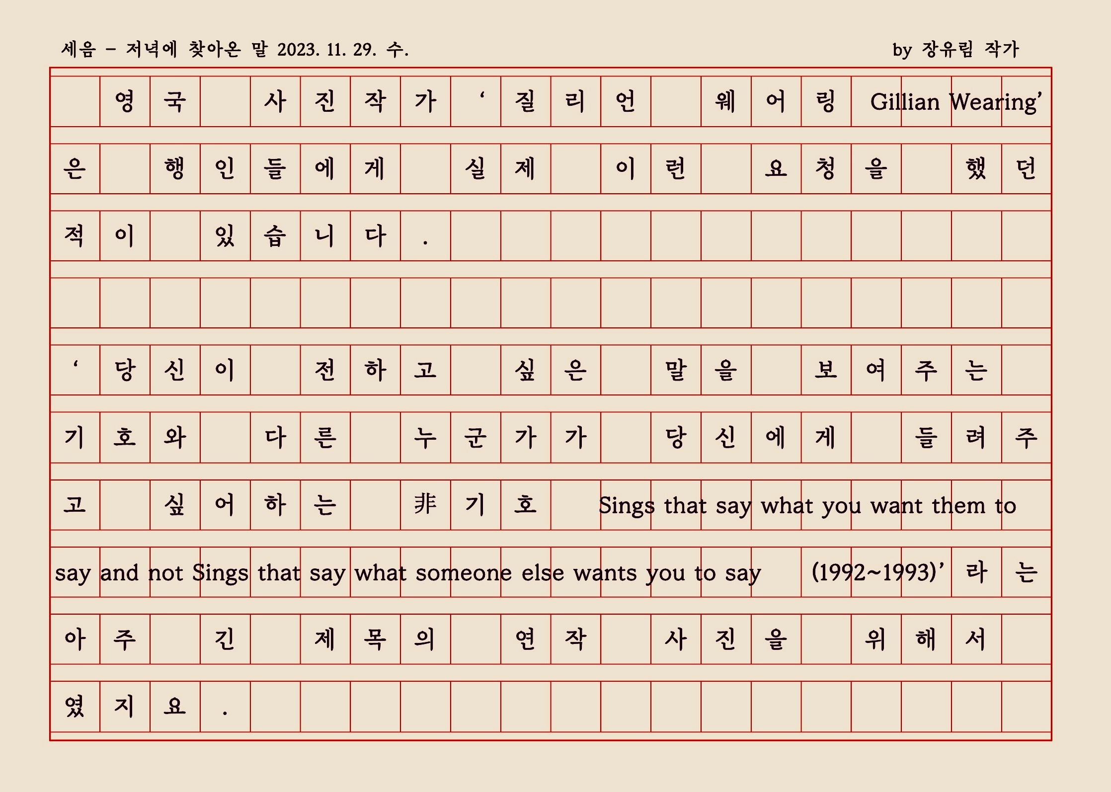 "질리언 웨어링의 이 연작에서는 행인들의 외양과 속마음 사이의 간극이 느껴지지요.