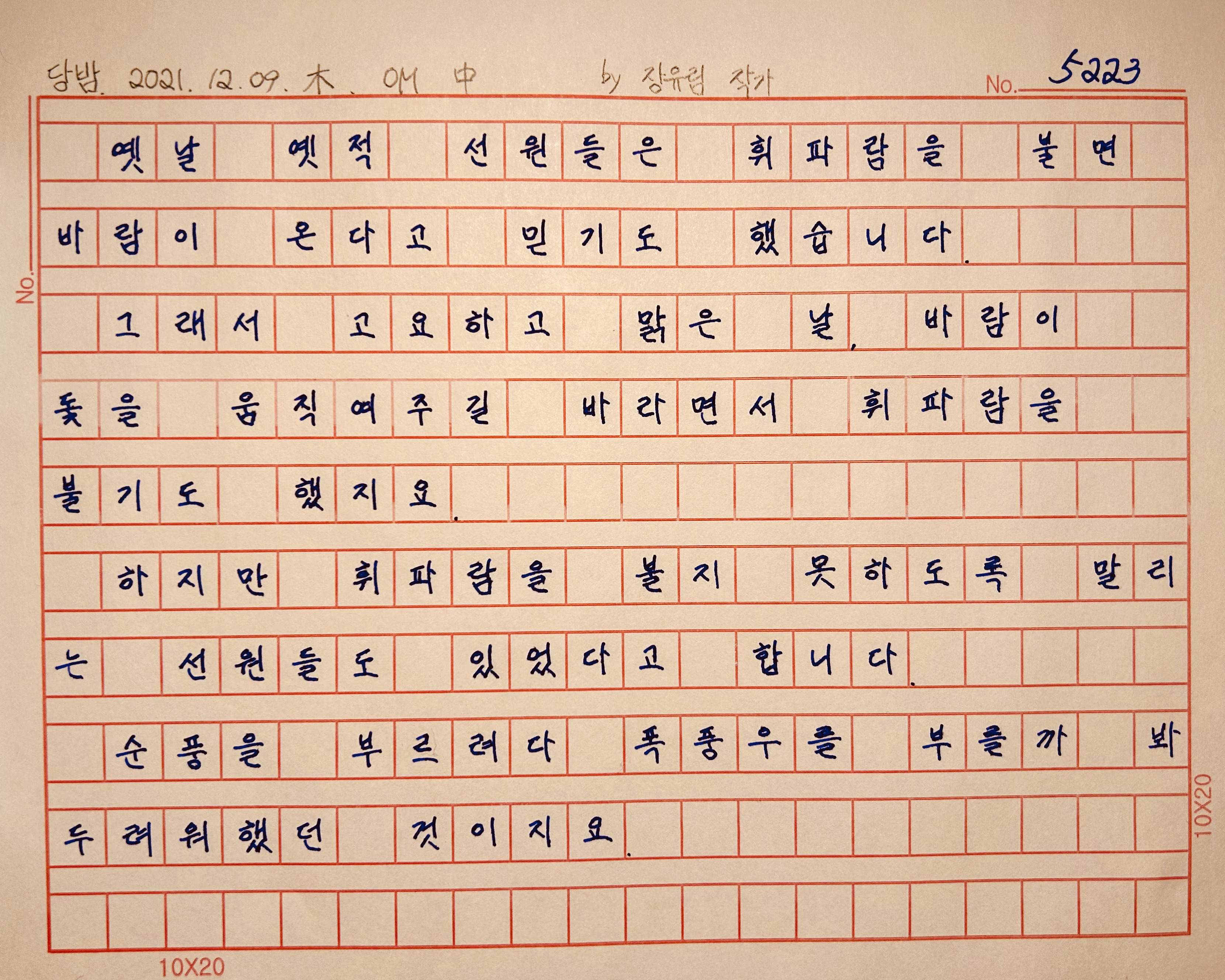이 휘파람이 작고 순한 바람을 몰고 와 주길 바라면서 말입니다."