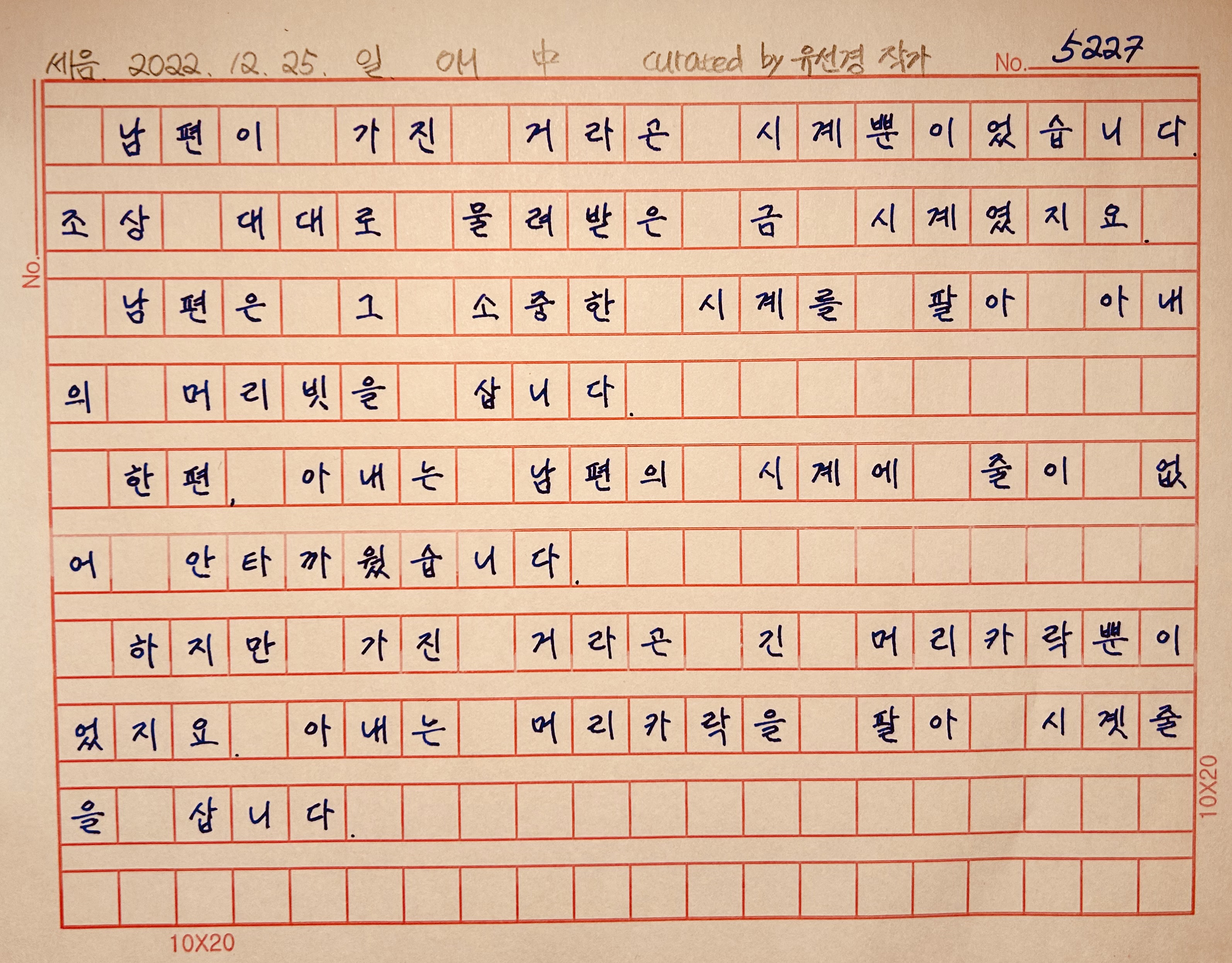 "어려서 읽었던 오 헨리의 단편 소설 '크리스마스 선물 The Gift of the Magi' 이야기입니다.