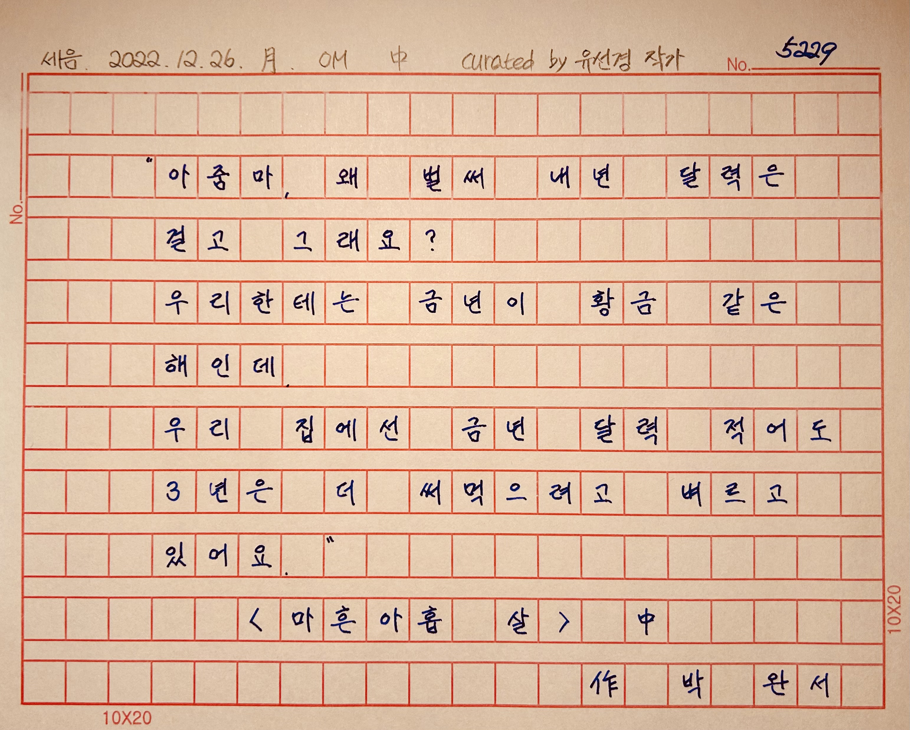 "달력만 그대로 걸어 놓는다고, 가는 세월 안 가고 먹을 나이에 안 먹는 게 아니라는 거 누군들 모를까요.