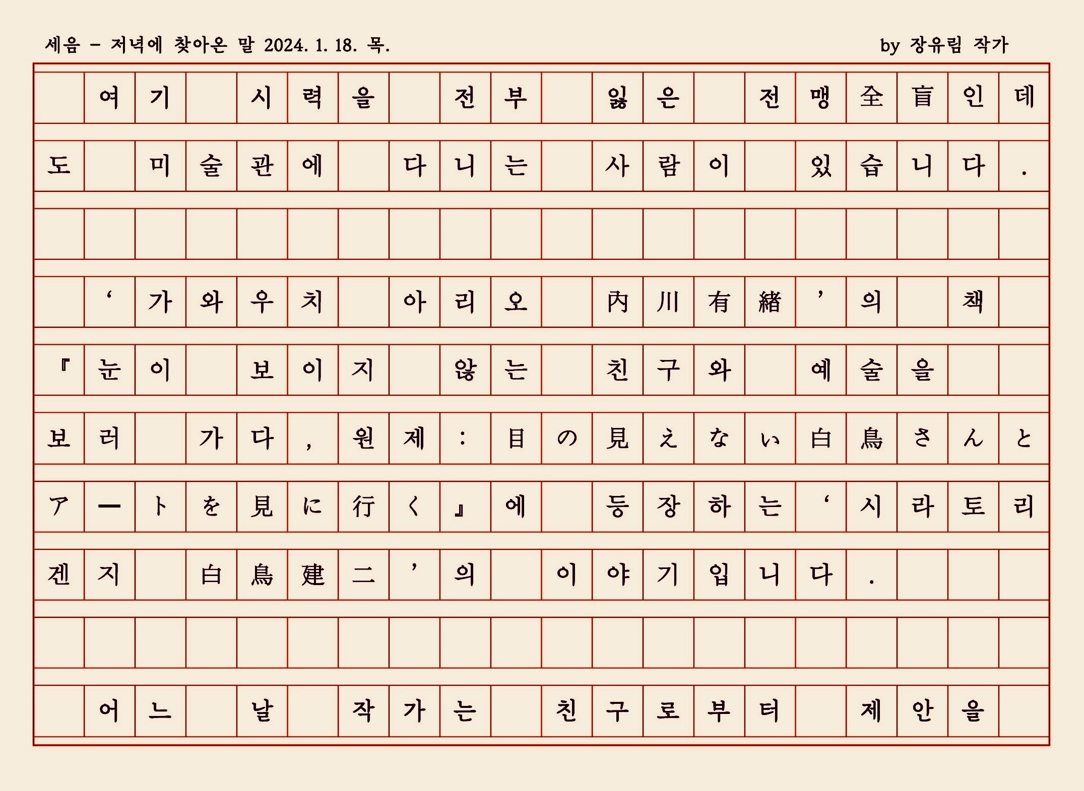 작가는 시라토리 씨와의 관람 경험을 통해서 눈의 해상도가 올라가는 느낌이었다고 말합니다.
