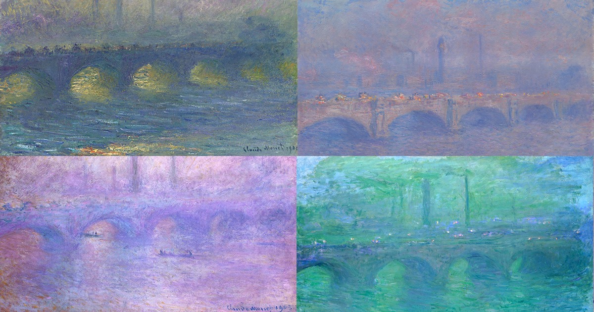 "템즈 Thames 강이 보이는 사보이 Savoy 호텔 발코니에서, 모네가 워털루 브리지 Waterloo Brige 를 그려낸 40점이 넘는 그림들 가운데 같은 그림은 한 점도 없습니다.
