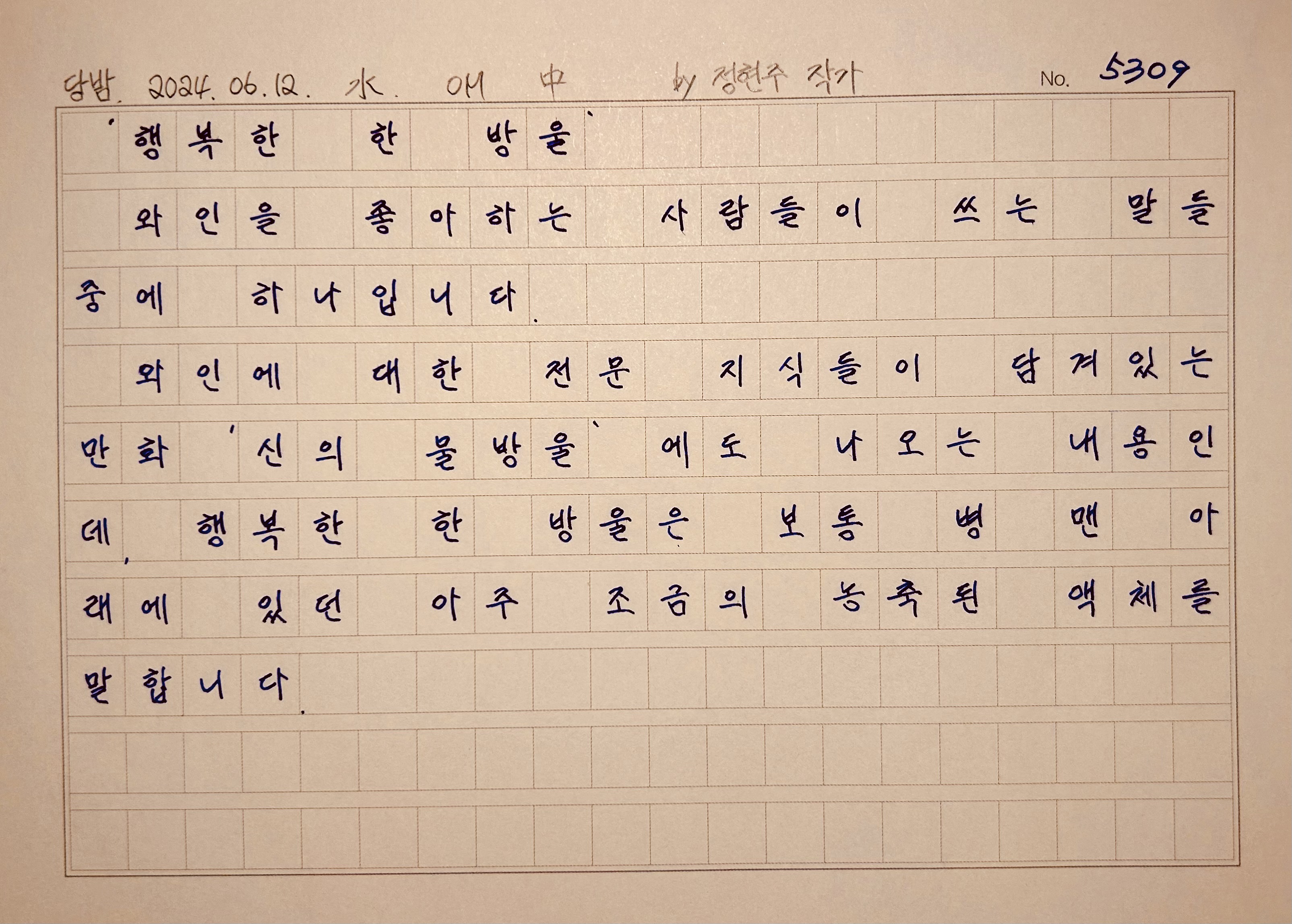 "가장 오래 병안에 있었기 때문에, 충분히 열린 상태로 농익은 맛을 내는 행복한 한 방울은.