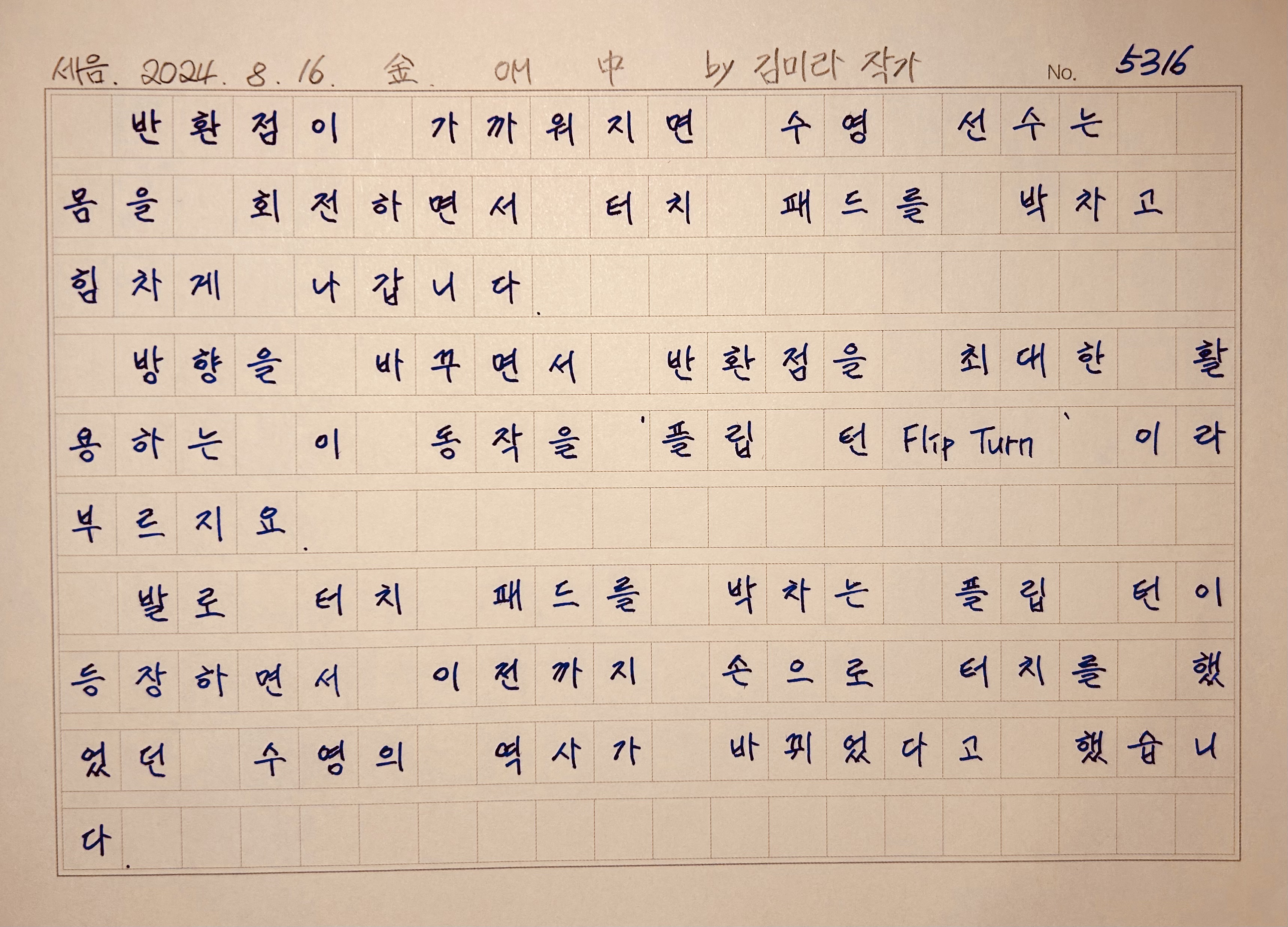 터치패드를 찍고 힘차게 방향을 바꾼 수영 선수처럼, 올해의 후반부를 잘 살아야겠다는 생각을 해봅니다."