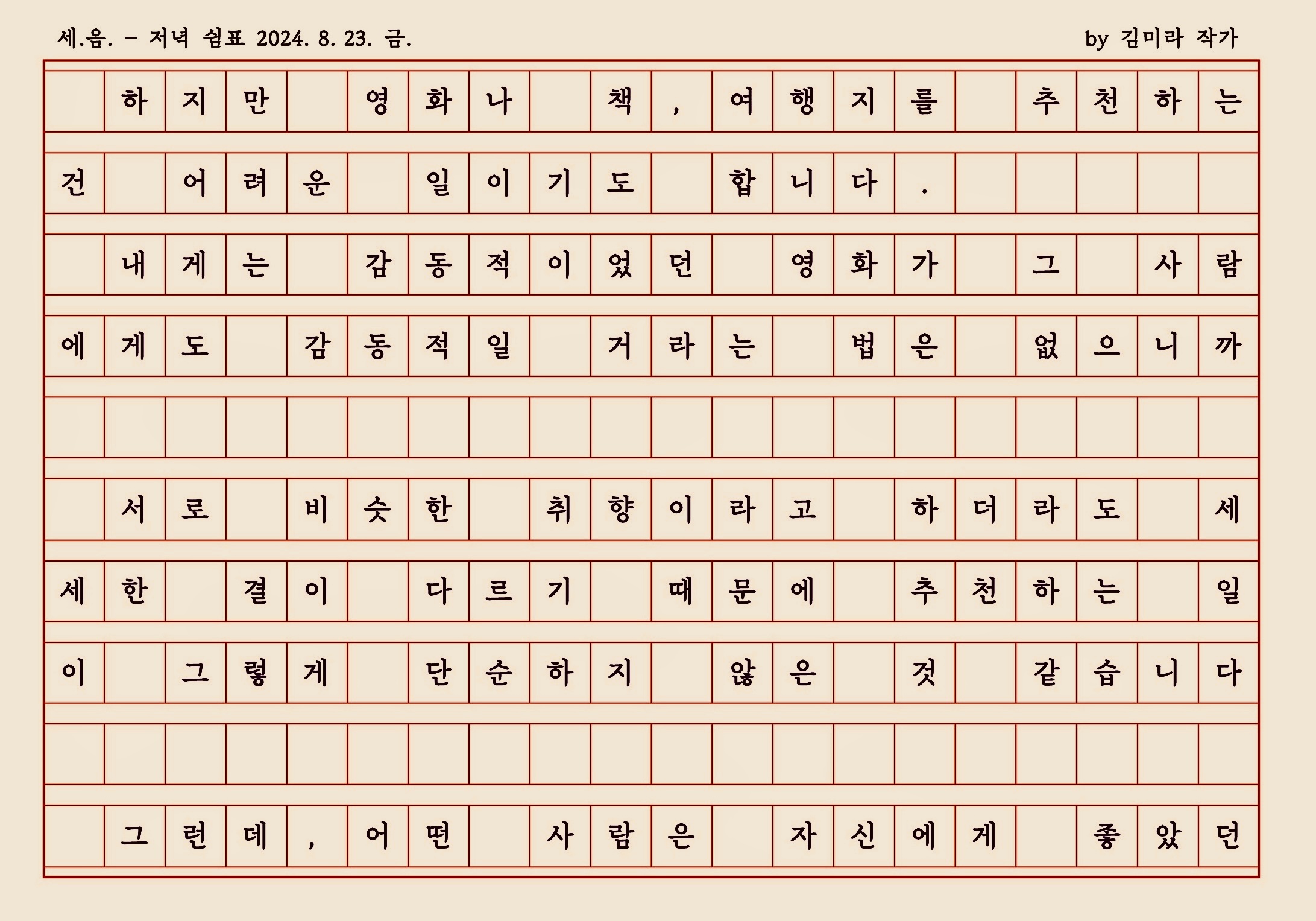 누군가의 마음을 헤아리는 진심이야말로 좋은 추천의 핵심이 될 거라는 생각이 듭니다.