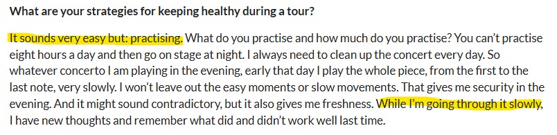공연할 곡을 첫 음표부터 마지막 음표까지 빼놓는 부분 없이 아주 천천히 연습하는 게 그 방법이라고 합니다.