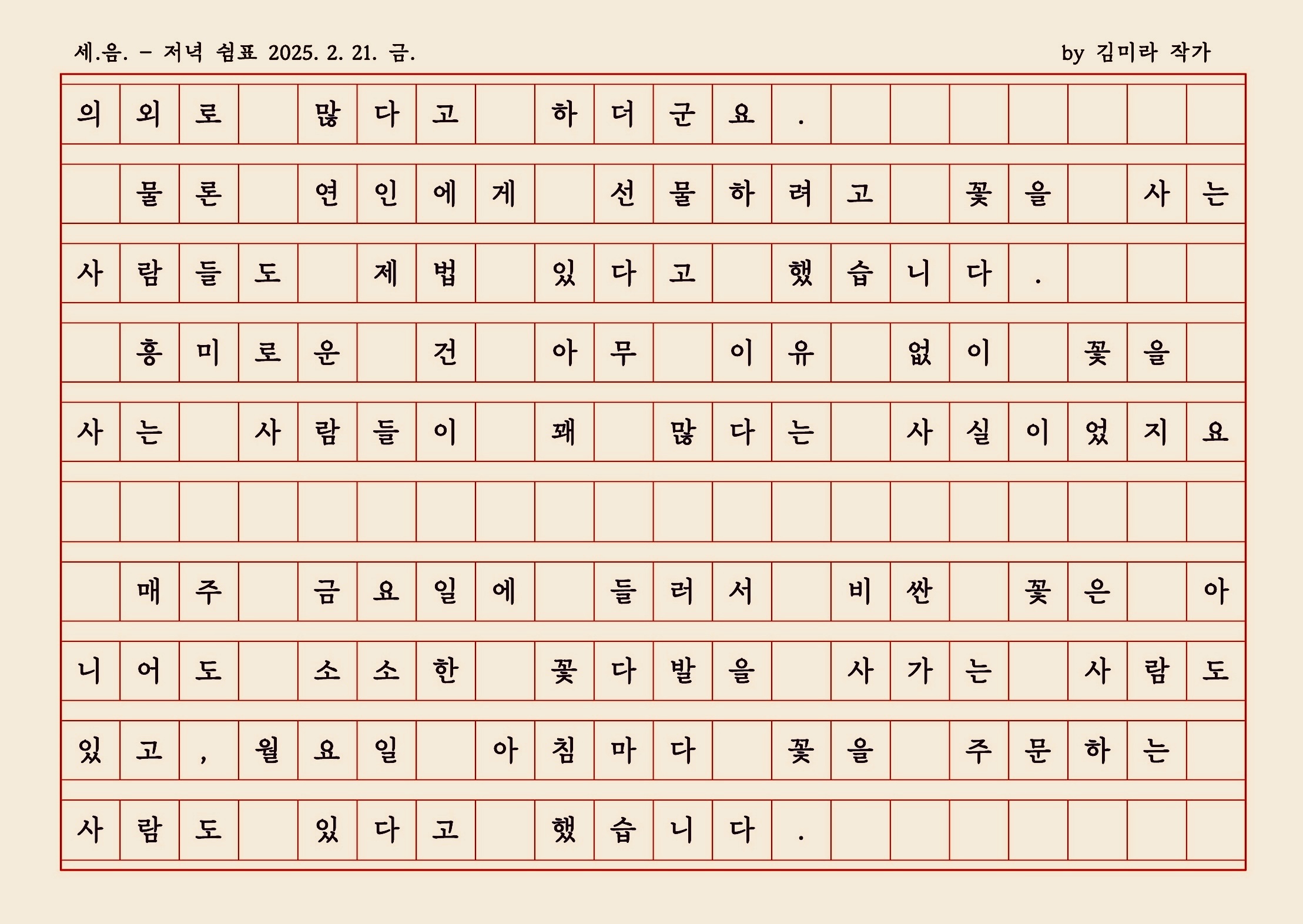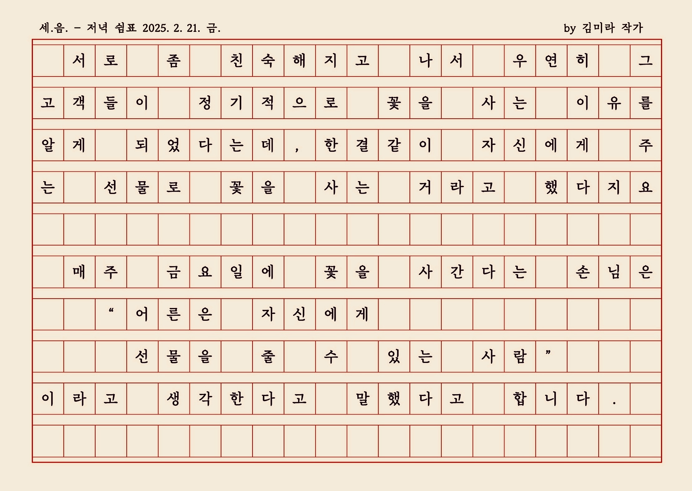 가끔은 우리도 아무 이유 없이 자신에게 꽃다발을 안겨줄 때가 있으면 좋겠다 생각해 봅니다."