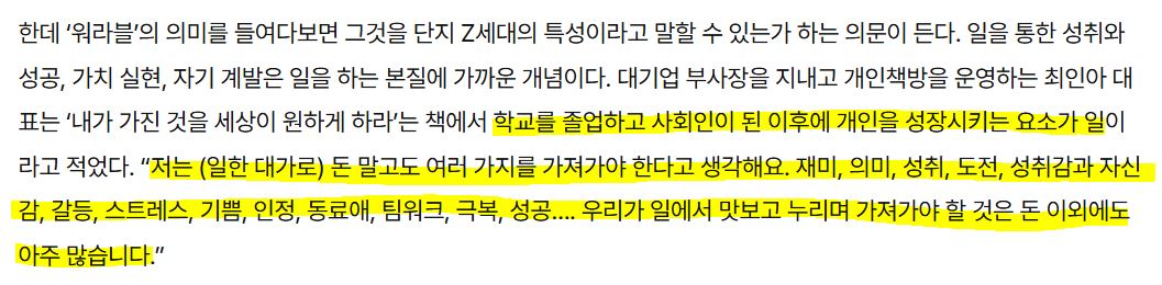 대신 워라하-워크 앤 라이프 하모니, 다시 말해서 일과 삶의 조화를 추구한다고 말했습니다.
