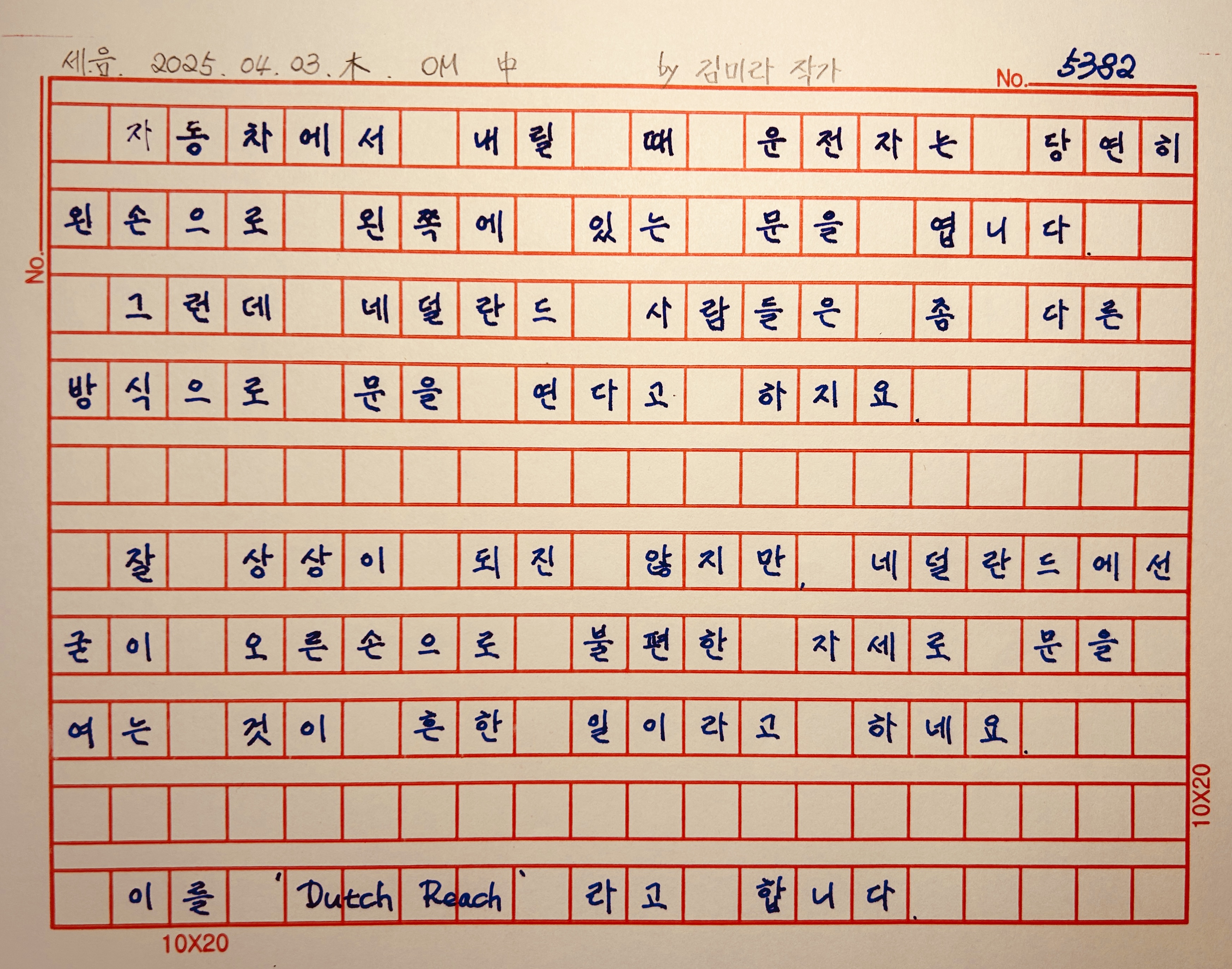 도로 쪽 반대편 손을 사용하여 문을 여는 방법입니다.